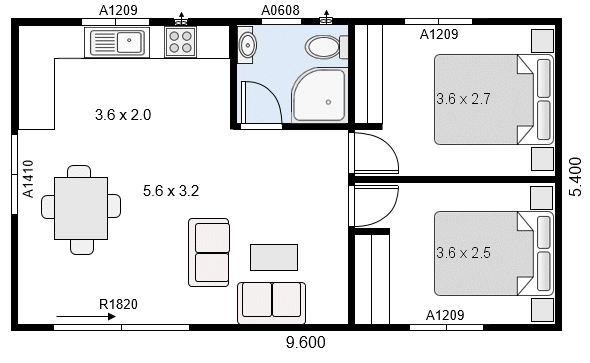 9.6m wide x 5.4m deep (approx. 51.84m²)